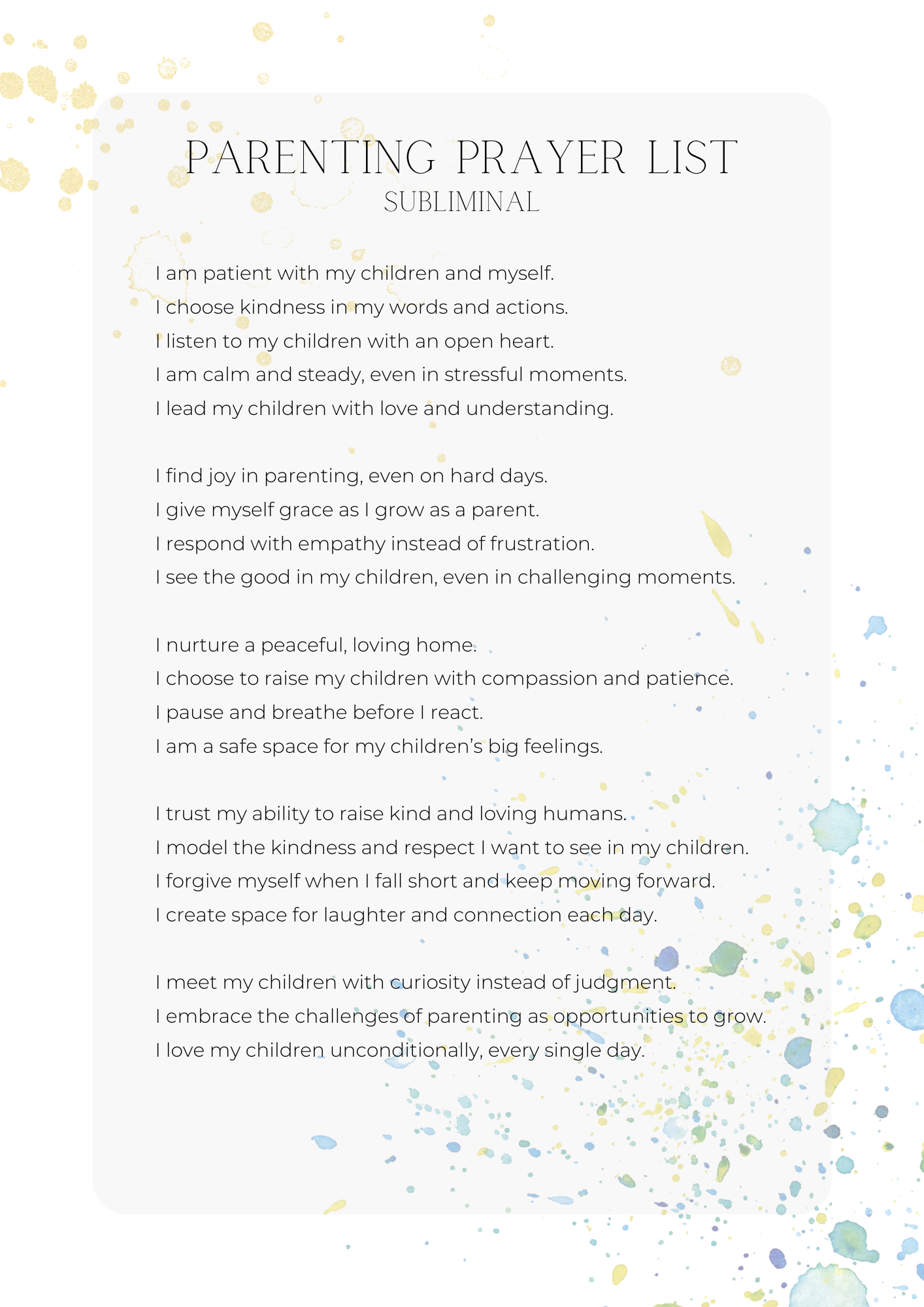 Whether you’re looking for more patience as a parent, helping your child feel confident, or simply bringing calm energy into your day, these audios work quietly in the background to shift your mindset and energy. Just press play and let your subconscious do the work while you go about your day.